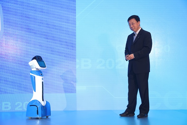 杨文升副行长展示建设银行金融生态系统并与智能机器人进行互动