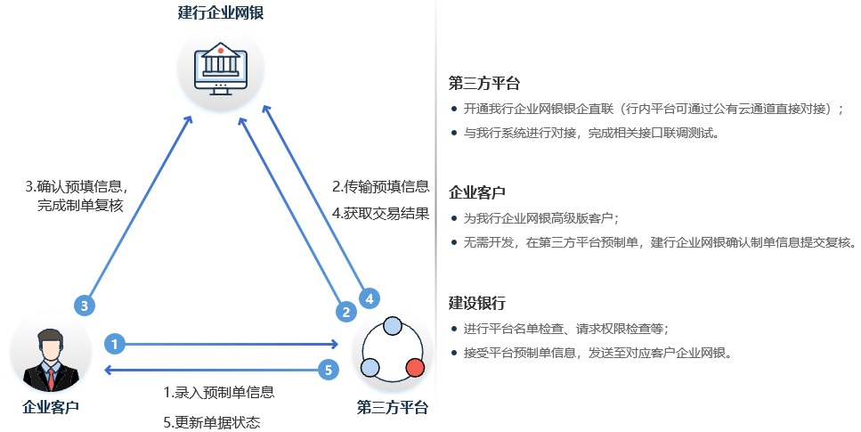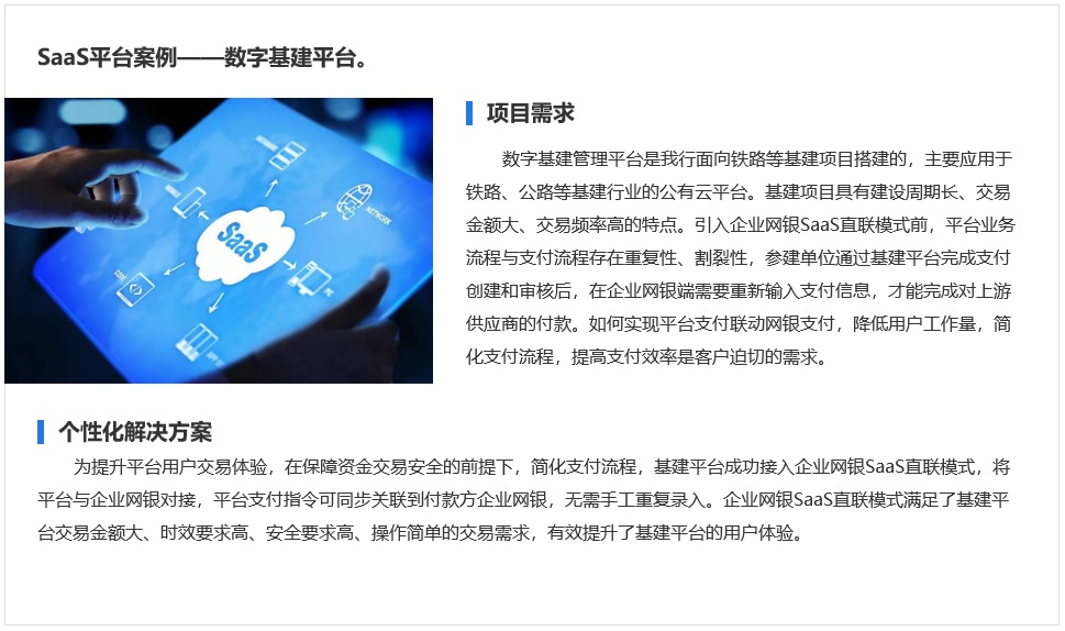 银行系统与互联网SaaS平台建立总对总网银直联,使平台会员用户免去直联开发测试,快速接入使用银行服务。