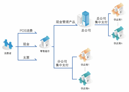 零售超市行业每天会有大量的现金收入,同时又需要大量的零钞; 拥有众多供应商,与供应商的资金结算周期一般为三个月左右,结算时点较为集中;对于管理能力较强的企业,总部一般会集中管理供应商,各分支企业的营业收入在指定时间内归集至总部,由总部集中向供应商支付。因此,对企业资金流提出了更高的要求,需要银行在现金上门收款、零钞配送、尾箱寄存、资金归集、供应商付款等方面提供更加安全、便捷有效的服务。