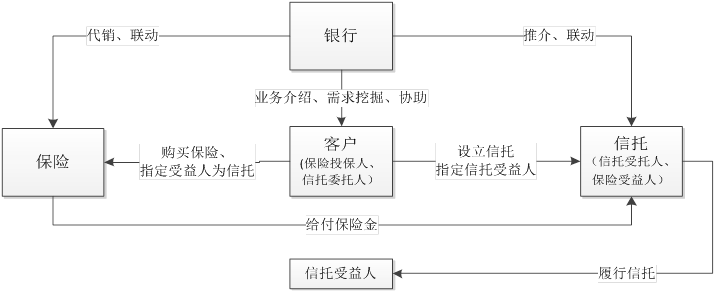“私享久远”私人银行保险信托业务是将保险金债权作为信托财产的综合型金融服务,其基本业务模式为,建设银行组织建立保险信托业务关系,并介绍及协助客户购买相应保险产品且指定保险受益人为信托公司,达到保险给付条件时,保险金进入信托专户,由信托公司依据信托合同约定进行管理、分配。