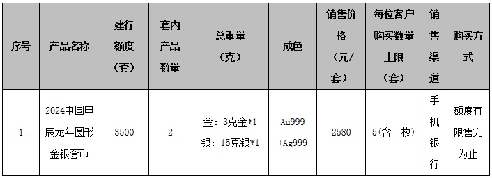 根据中国人民银行贵金属纪念币发行安排,“2024中国甲辰(龙)年贵金属纪念币”于11月陆续发行,我行根据安排将参与以上项目的第三轮销售工作。现将有关事项公告如下: