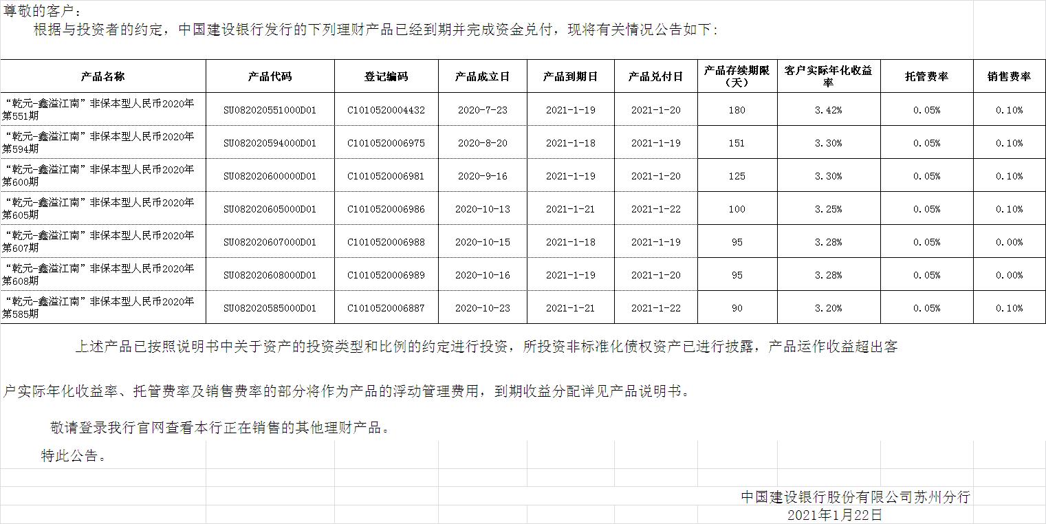 中国建设银行理财产品终止及清算公告